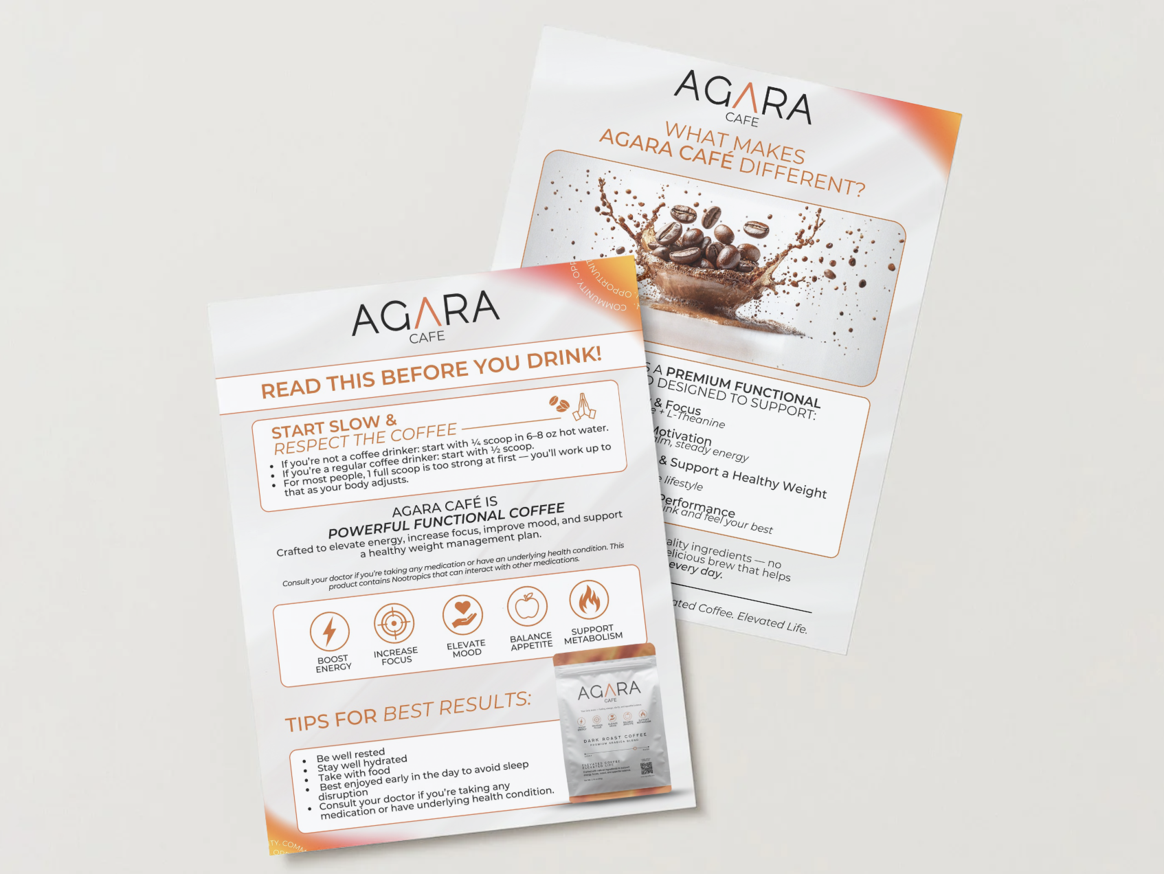 A print-ready product flyer designed to help explain what makes AGARA Café different. Ideal for tastings, events, and in-person conversations, this flyer walks through key benefits, ingredients, and best-use guidance to support confident product sharing.